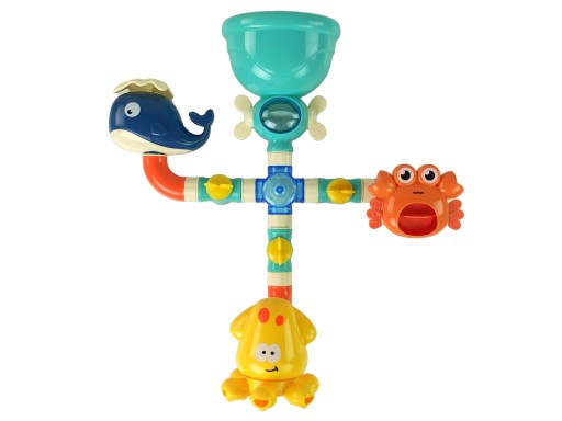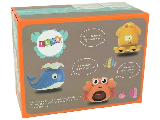 - Zawiera trzy urocze morskie stworzenia: granatowego wieloryba, czerwonego kraba i żółtą ośmiornicę. W jaki sposób dostarczają one rozrywki? To proste! Wlewając wodę do górnego niebieskiego zbiorniczka, dziecko może obserwować, jak woda spływa przez różne elementy zabawki.
