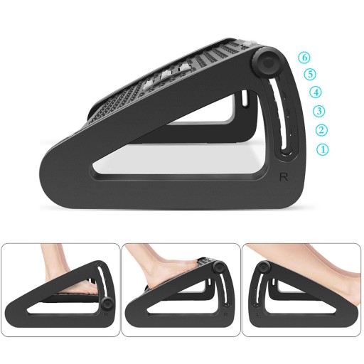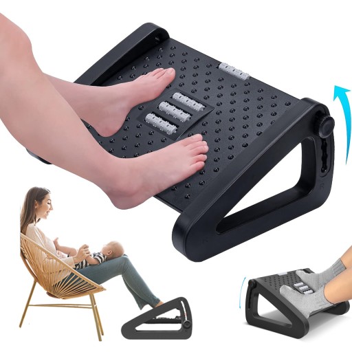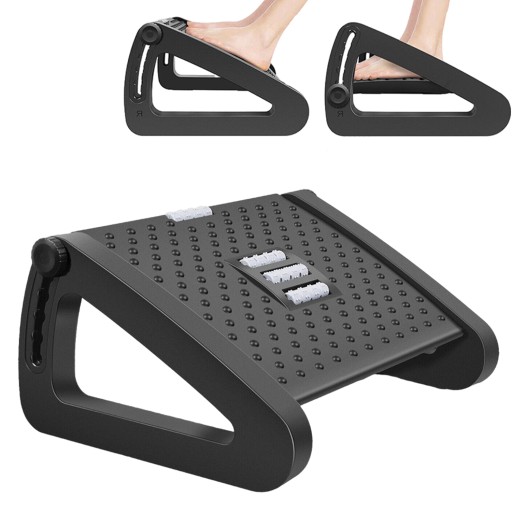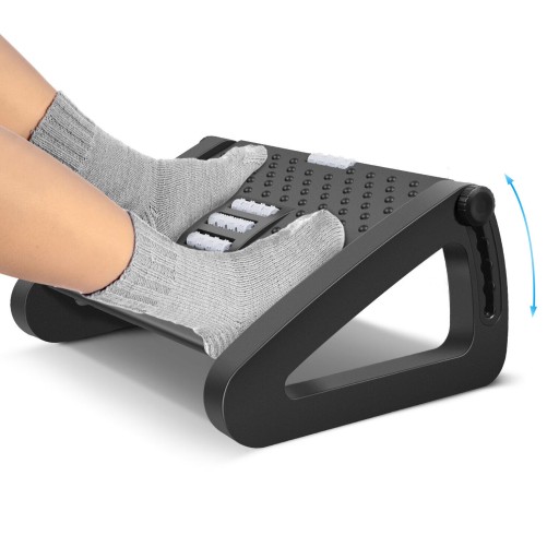 - Dzięki teksturowanej powierzchni i dużej, swobodnie pływającej platformie pokrytej okrągłymi pokrętłami i rolkami masującymi, ten podnóżek może pomóc masować i stymulować stopy oraz pomóc zrelaksować podeszwy stóp w godzinach pracy.