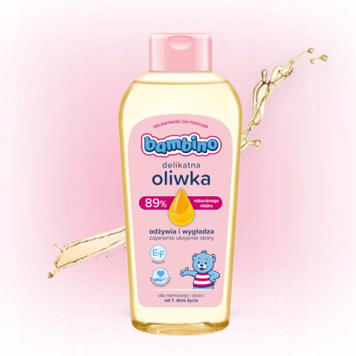 Bambino oliwka przeznaczona do pielęgnacji dzieci i niemowląt już od pierwszych dni życia w codziennej pielęgnacji. Zawiera aż 89% naturalnego olejku przez co formuła oliwki dla dzieci jest wyjątkowo naturalna i łagodna.
