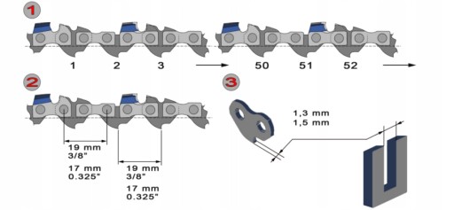 Dołączone do zestawu łańcuchy pasują do wszystkich pilarek pracujących z łańcuchami 0,325. Charakteryzuje się wysokim współczynnikiem odporności na ścieranie, zwiększając żywotność produktu. Przedstawione łańcuchy zostały zaprojektowane w taki sposób, by zredukować do absolutnego minimum rozciąganie się ogniw.