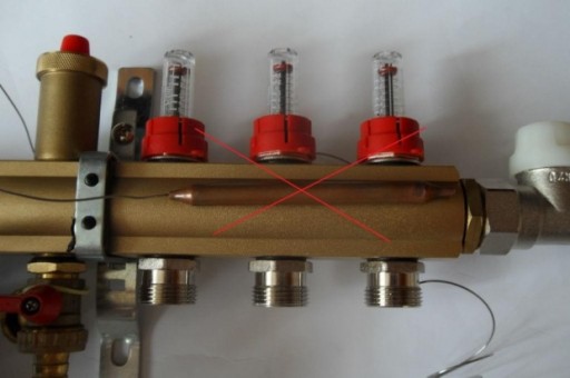 Takie mocowanie kapilary powoduje nieprawidłowy odczyt temperatury (gdy układ zamkniemy w szafce, gdzie temperatura może dojść do 60 stopni dlatego, że rozdzielacz i pompa oddają ciepło to odczyt może wynosić nawet 30% błędów co jest bardzo niekorzystne dla posadzki)