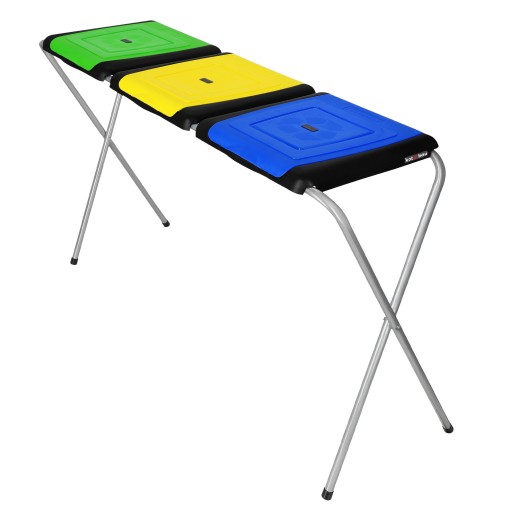 Stojak do segregacji odpadów posiada 3 miejsca na worki, dzięki czemu pozwala na ich wygodne rozdzielenie na konkretne rodzaje odpadów (żółty kolor oznacza metal i plastik, niebieski – papier, a zielony – szkło).