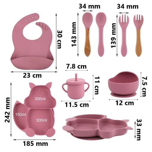 Naczynia silikonowe dla dzieci wiewiórka zestaw 9 elementów ciemny różowy