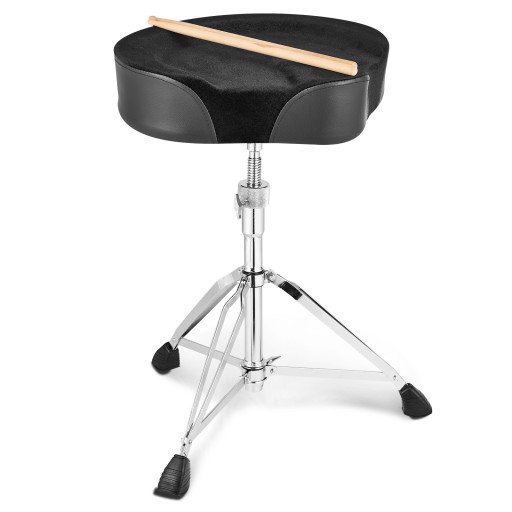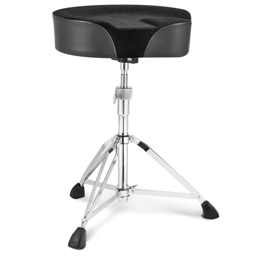 Nasz stołek perkusyjny posiada grube skórzane siedzisko połączone z miękką flokowaną powierzchnią, zapewniającą doskonałą absorpcję wilgoci i oddychalność. Obraca się o 360° i można go łatwo dostosować do preferowanego kąta siedziska. Dzięki solidnej stalowej ramie może z łatwością wytrzymać obciążenie do 227 kg/500 funtów.