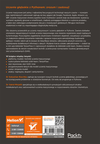 Oto obszerny przewodnik po uczeniu maszynowym i uczeniu głębokim w Pythonie. Zawiera dokładne omówienie najważniejszych technik uczenia maszynowego oraz staranne wyjaśnienie zasad rządzących tą technologią. Poszczególne zagadnienia zilustrowano mnóstwem wyjaśnień, wizualizacji i przykładów, co znakomicie ułatwia zrozumienie materiału i sprawne rozpoczęcie samodzielnego budowania aplikacji i modeli, takich jak te służące do klasyfikacji obrazów, odkrywania ukrytych wzorców czy wydobywania dodatkowych informacji z danych. Wydanie trzecie zostało zaktualizowane - znalazł się w nim opis biblioteki TensorFlow 2 i najnowszych dodatków do biblioteki scikit-learn. Dodano również wprowadzenie do dwóch nowatorskich technik: uczenia przez wzmacnianie i budowy generatywnych sieci przeciwstawnych (GAN).