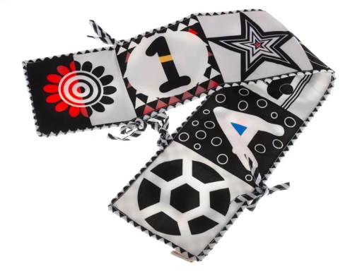 Magiczna materiałowa książeczka w kontrastowe wzory to świetna propozycja dla dzieci dopiero poznających świat. Znajdziesz w niej aż 12 różnch wzorów.