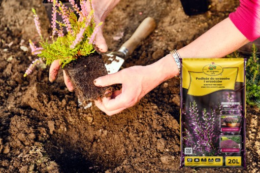 Następnie wsadzamy bryłę korzeniową i uzupełniamy otwór podłożem do wrzosów i wrzośców.