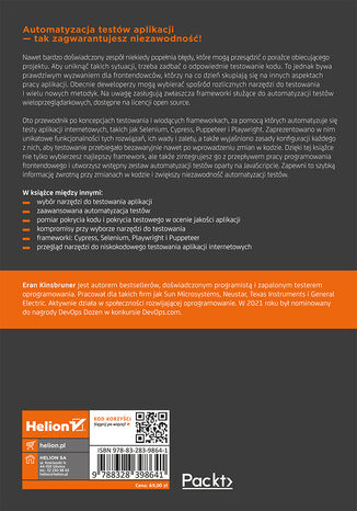 Oto przewodnik po koncepcjach testowania i wiodących frameworkach, za pomocą których automatyzuje się testy aplikacji internetowych, takich jak Selenium, Cypress, Puppeteer i Playwright. Zaprezentowano w nim unikatowe funkcjonalności tych rozwiązań, ich wady i zalety, a także wyjaśniono zasady konfiguracji każdego z nich, aby testowanie przebiegało bezawaryjnie nawet po wprowadzeniu zmian w kodzie. Dzięki tej książce nie tylko wybierzesz najlepszy framework, ale także zintegrujesz go z przepływem pracy programowania frontendowego i utworzysz wstępny zestaw automatyzacji testów oparty na JavaScripcie. Zapewni to szybką informację zwrotną przy zmianach w kodzie i zwiększy niezawodność automatyzacji testów.