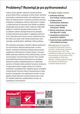Oto znakomity, przystępny i świetnie napisany podręcznik do nauki Pythona. Opisuje podstawy kodu i struktur danych i stopniowo wprowadza bardziej zaawansowane zagadnienia, takie jak praca z bazami danych i stronami WWW, podstawy działania chmury obliczeniowej, uczenia maszynowego i strumieniowania zdarzeń. Poza standardową biblioteką Pythona przedstawiono tu przydatne zewnętrzne pakiety, dokładniej opisano te najbardziej pomocne. Omówiono dobre praktyki tworzenia, testowania i diagnozowania kodu. Książka zawiera też mnóstwo wskazówek i przykładów kodu. Wyjaśnia pewne szczególne funkcjonalności Pythona, których stosowanie jest o wiele lepszym rozwiązaniem niż adaptowanie technik z innych języków. Nawet jeśli dziś o programowaniu wiesz mniej niż niewiele, dzięki temu podręcznikowi staniesz się prawdziwym pythonowcem!