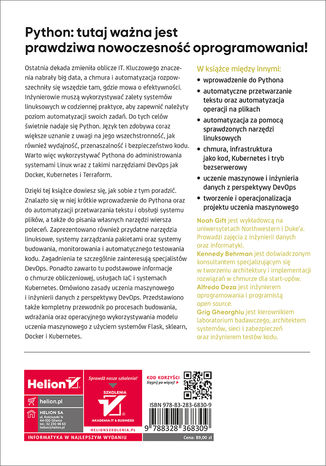 Dzięki tej książce dowiesz się, jak sobie z tym poradzić. Znalazło się w niej krótkie wprowadzenie do Pythona oraz do automatyzacji przetwarzania tekstu i obsługi systemu plików, a także do pisania własnych narzędzi wiersza poleceń. Zaprezentowano również przydatne narzędzia linuksowe, systemy zarządzania pakietami oraz systemy budowania, monitorowania i automatycznego testowania kodu. Zagadnienia te szczególnie zainteresują specjalistów DevOps. Ponadto zawarto tu podstawowe informacje o chmurze obliczeniowej, usługach IaC i systemach Kubernetes. Omówiono zasady uczenia maszynowego i inżynierii danych z perspektywy DevOps. Przedstawiono także kompletny przewodnik po procesach budowania, wdrażania oraz operacyjnego wykorzystywania modelu uczenia maszynowego z użyciem systemów Flask, sklearn, Docker i Kubernetes.