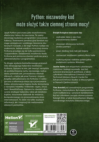 To drugie wydanie bestsellerowego przewodnika po hakerskich możliwościach Pythona. Opisano w nim, jak tworzyć narzędzia do podsłuchiwania ruchu sieciowego, wykradania poświadczeń, prowadzenia włamań siłowych, a także jak pisać fuzzery i trojany. Książkę zaktualizowano do Pythona 3 i wzbogacono o informacje dotyczące przesuwania bitów, utrzymywania higieny kodu, korzystania z narzędzia Volatility i bibliotek: ctypes, struct, lxml i BeautifulSoup. Opisano tu również ofensywne strategie hakerskie, takie jak dzielenie bajtów, stosowanie bibliotek do widzenia komputerowego czy przeszukiwanie stron internetowych. To zbiór nie tylko ważnych informacji, ale i inspiracji do realizowania własnych pomysłów.
