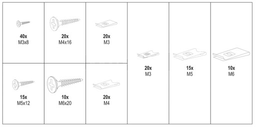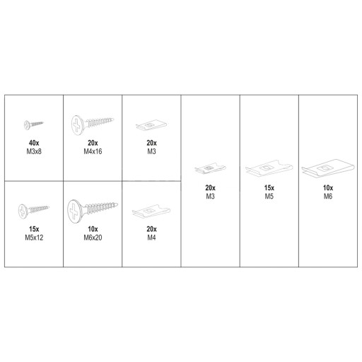 - Zestaw składa się z 160 sztuk wkrętów i podkładek do karoserii, o rozmiarach od M3Y8 mm do M6Y20 mm.