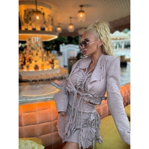 Marynarka o krótszym kroju wykonana z subtelnego miłego w dotyku muślinu, 100% bawełna w liliowym, zgaszonym odcieniu wpadającym w szarości z różem. Produkt z kołnierzykiem, klapami wiązana na dole za pomocą ozdobnych, podwójnych warkoczy, które dodają efektu wow całej stylizacji. Dół marynarki wokół zdobiony jest falbankami - ten sam element znajduje się w innych częściach zestawu. Marynarka z podszewką w podobnym kolorze.