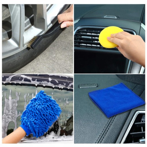 26 sztuk Zestaw szczotek do czyszczenia samochodu: zawiera 5 szczotek do detali, 3 mini szczotki do kół, 2 grube gąbki, 1 szczotkę do odpowietrznika, 1 ściereczkę do czyszczenia, 1 rękawicę do mycia samochodu, 6 nakładek do szorowania, 2 gąbki do szorowania, 1 samoprzylepny krążek, 3 szczotki i 1 przedłużacz.