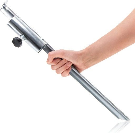 Uchwyt zaprojektowany do łatwego wbijania w ziemię, co gwarantuje jego pewne i solidne osadzenie, nawet w luźnym piasku plażowym czy miękkiej glebie.