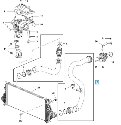 Sprzedam nowy, oryginalny przewód intercoolera do Opla Insigni B (numer 8 na schemacie), pasuje do silników 2.0 diesel o oznaczeniu B20DTH, D20DTH.