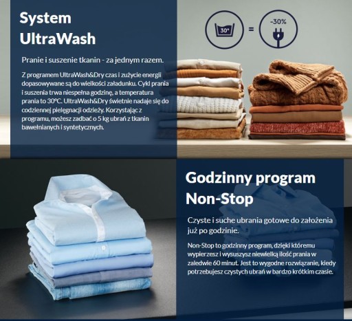 - Funkcje dodatkowe: funkcja pauzy, możliwość skracania czasu prania, pranie wstępne, wybór czasu suszenia , wybór stopnia suszenia, wyświetlacz LED, wyświetlanie czasu do końca programu