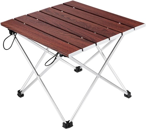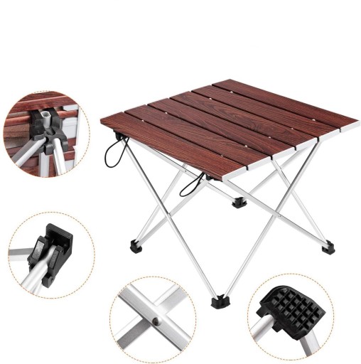 - Łatwy montaż: składany design, nie wymaga użycia narzędzi. Aluminiową ramę podstawową można łatwo rozłożyć i złożyć. Unikalna konstrukcja zawiasów umożliwia łatwe i wytrzymałe połączenie z blatem z rysunkiem słojów. Szybkie i łatwe rozkładanie i składanie w ciągu 30 sekund.