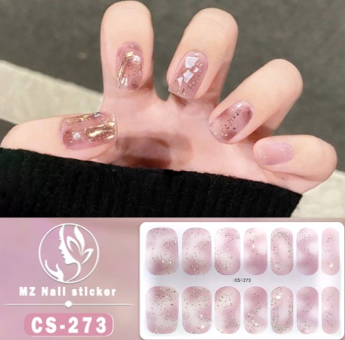Naklejki na paznokcie w różnych odcieniach nude ozdobione są złotym brokatem. Stylizacja jest ponadczasowa, przyciąga uwagę i świetnie sprawdzi się na różne wyjścia.
