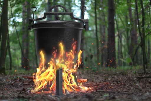 Kociołek możesz ustawić na nóżkach bezpośrednio na ognisku bądź powiesić go na uchwycie nad źródłem ognia.