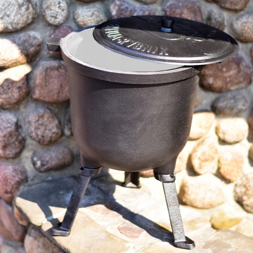 Kociołek wyposażony jest w solidną pokrywę z otworem, trzy stabilne nóżki oraz przykręcany uchwyt mocno dociskający pokrywę. Grube dno kociołka żeliwnego sprawia, że przygotowane dania wolną stygną. Żeliwo bardzo dobrze i równomiernie przewodzi ciepło.
