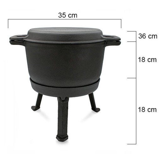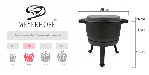 Oryginalny kociołek Meyerhoff wykonany z najwyższej jakości stopu żeliwa odpornego na najwyższe temperatury. Kociołek posiada wygodne uchwyty ułatwiające przenoszenie garnka i pokrywy. Jedyny w swoim rodzaju zestaw do prażenia ziemniaków, czy innych potraw składa się z trzech części. Nóżek w formie podstawki, garnka oraz pokrywy pełniącej jednocześnie funkcję żeliwnego grilla. Dzięki wytłoczeniu na pokrywie masz pewność, że kupujesz oryginalny i bezpieczny produkt.