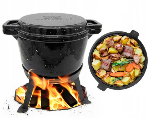 Oryginalny kociołek Meyerhoff wykonany z najwyższej jakości stopu żeliwa odpornego na najwyższe temperatury. W środku pokryty żaroodporną emalią, która chroni i zabezpiecza wnętrze kociołka, dodatkowo ułatwiając jego mycie i konserwacje (nie ma potrzeby impregnowania po każdym użyciu). Kociołek posiada wygodne uchwyty ułatwiające przenoszenie garnka i pokrywy. Jedyny w swoim rodzaju zestaw do prażenia ziemniaków, czy innych potraw składa się z trzech części. Nóżek w formie podstawki, garnka oraz pokrywy pełniącej jednocześnie funkcję grilla. Dzięki wytłoczeniu na pokrywie masz pewność, że kupujesz oryginalny i bezpieczny produkt.