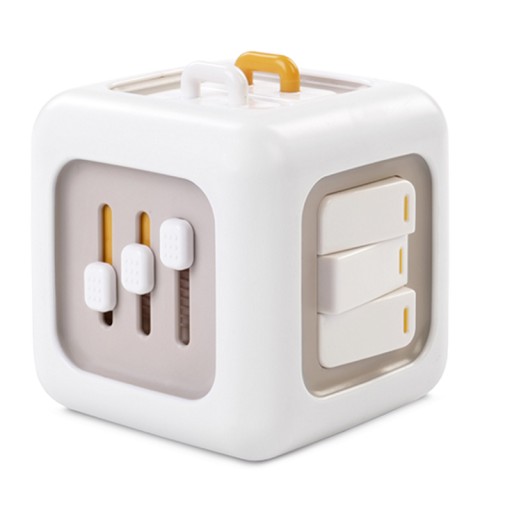 Funkcje: 6 boków z elementami manipulacyjnymi - obracany wiatraczek, 3 przyciski włącznika, 3 suwaki z terkotką, gałka do obracania, wysuwana szufladka, lusterko z 4 przyciskami, Pozostałe informacje: wym. kostki: 8,5 x 8,5 x 8,5 cm., 12M+