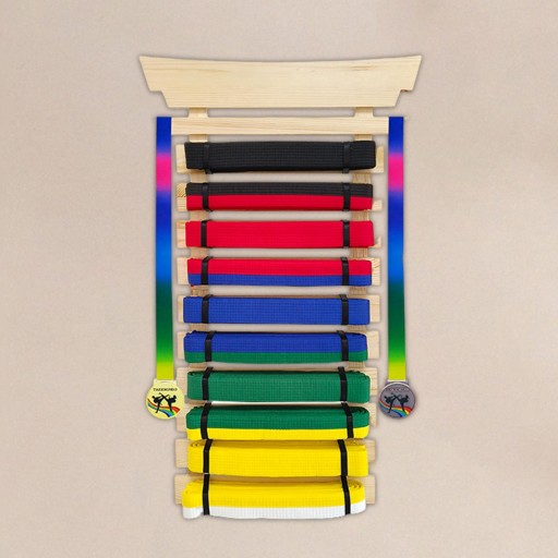 [Materiał najwyższej jakości]: Wykonany z drewna stojak na pasek Taekwondo został zaprojektowany tak, aby przetrwać i utrzymać pasy i medale w nieskazitelnym stanie.