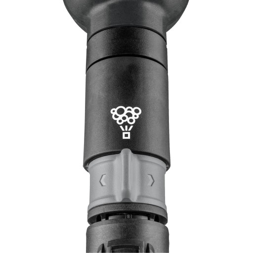 Nanoszenie piany, usuwanie uporczywych zabrudzeń za pomocą wysokociśnieniowego płaskiego strumienia lub pracę za pomocą miękkiej szczotki – wszystko to jest możliwe bez konieczności zmiany akcesoriów. Żądaną funkcję wybiera się za pomocą dźwigni w obszarze uchwytu szczotki.