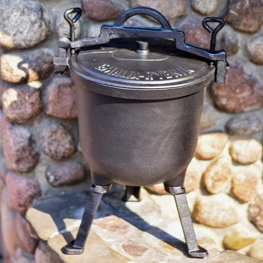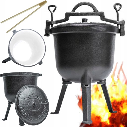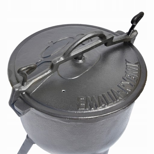 Kociołek wyposażony jest w solidną pokrywę z otworem, trzy stabilne nóżki oraz przykręcany uchwyt mocno dociskający pokrywę. Grube dno kociołka żeliwnego sprawia, że przygotowane dania wolną stygną. Żeliwo bardzo dobrze i równomiernie przewodzi ciepło.