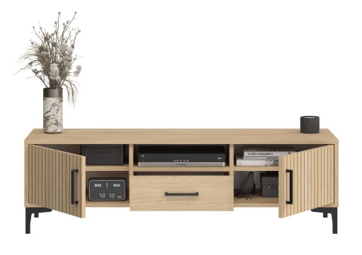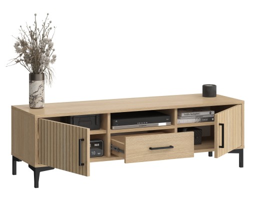 Szafka rtv jest nie tylko nowoczesna, ale także praktyczna - wewnątrz znajdują się półki, która pozwala na przechowywanie większej ilości rzeczy.