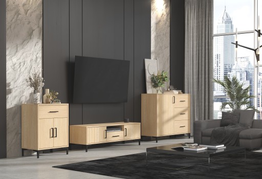 Fronty i korpus KOMODY COMO zostały wykonane z płyty laminowanej dąb sławonia i IMITACJI płyty ryflowanej, która jest łatwa w czyszczeniu oraz charakteryzuje się zwiększoną odpornością na wilgoć, zabrudzenia i uszkodzenia. Jej krawędzie zostały zabezpieczone obrzeżem ABS, które zapewnia estetyczne i trwałe wykończenie produktu.