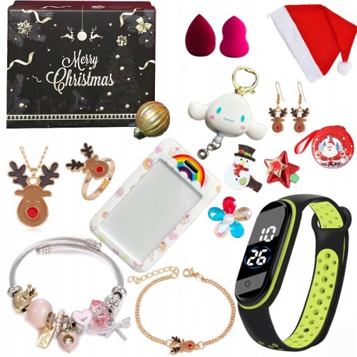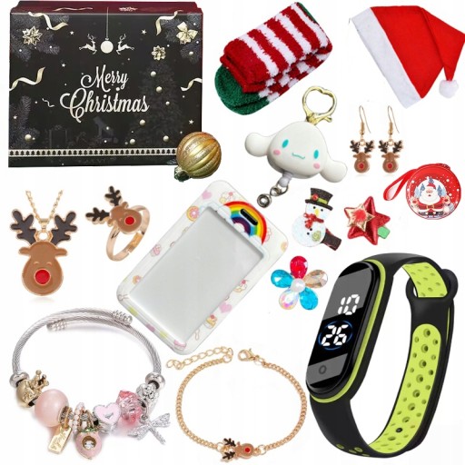 W zestawie znajduje się m.in.: Zegarek LED Kapelusz świąteczny Mała świąteczna torebka Zestaw biżuterii z reniferem, Zawieszka do identyfikatora / karty, Błyszczyk, Skarpetki świąteczne Bransoletka zawieszki, charmsy, Spinki do włosów, Kryształkowa broszka,