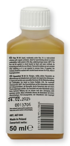 Ciekły, średnio aktywny topnik typu 1.1.2/3 A wg ISO 9454-1, alkoholowy roztwór kalafonii z dodatkiem aktywatorów organicznych, max. temperatura lutowania 280oC. Zawartość części całych 24%. Doskonale nadaje się do ręcznego cynowania w celu przywrócenia im lutowności.