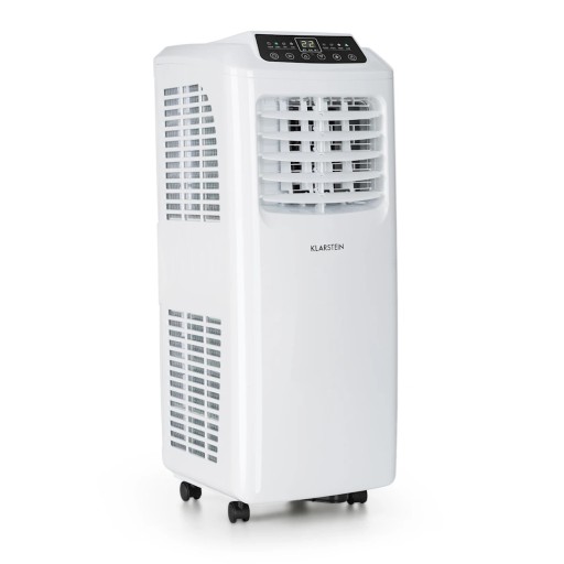 Zdalnie sterowany klimatyzator o klasie efektywności energetycznej A, z własnym systemem odparowania, wyświetlaczem LED, prostym w obsłudze panelem kontrolnym i 24-godzinnym wyłącznikiem czasowym.
