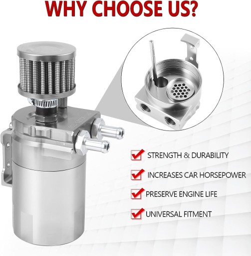 - Ten pojemnik na olej wychwytuje olej i wilgoć z przedmuchiwanych gazów, które powodują gromadzenie się węgla i szlamu w układzie dolotowym i silniku. Pojemnik zapobiega przedostawaniu się brudu i oleju z układu dolotowego do silnika. Utrzymuje silnik w czystości. Zwiększa moc i wydłuża żywotność silnika.