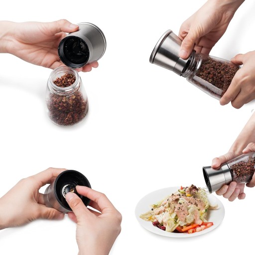 - ŁATWE KORZYSTANIE - aby skorzystać z ręcznego młynka należy napełnić szklany pojemnik solą, pieprzem lub inną przyprawą i przykręcić górny mechanizm. Następnie jedną ręką trzymamy młynek do góry nogami, a druga obracamy część ze stali nierdzewnej. Mielona przyprawa dozowana jest teraz przez dolną część młynka. Nie zapomnijmy zdjąć pokrywki i ustawić wielkość kawałów.