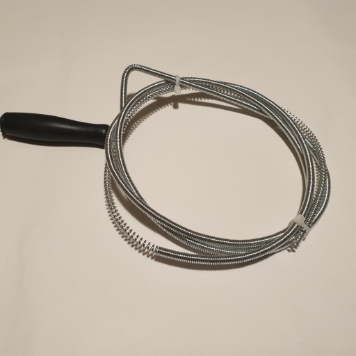 Na końcu sprężyny znajduje się ostra końcówka, którą wprowadzamy do rury kanalizacyjnej, kręcąc jednocześnie korbą. Po udrożnieniu rury wyciągamy sprężynę.