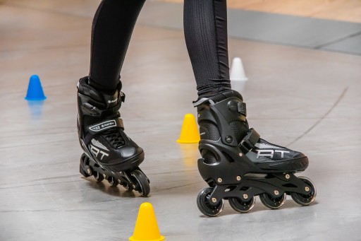 - W zestawie znajdują się się fabrycznie naostrzone płozy łyżwowe, klucze, śruby oraz dłuższe osie umożliwiające odkręcenie kółek i zamontowanie ich po obu stronach płozy rolkowej celem uzyskania pożądanej konfiguracji. Przełożenie kół nie wymaga wiedzy technicznej, jest przystępnie pokazane w dołączonej instrukcji obsługi i nie wymaga odkręcania płozy rolkowej.