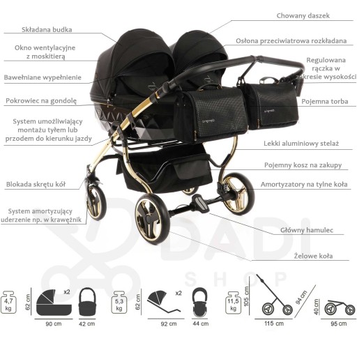 ➡️ Wózek bliźniaczy 4w1 Junama Diamond S Line Duo V2 02 czarno złoty | COSMO