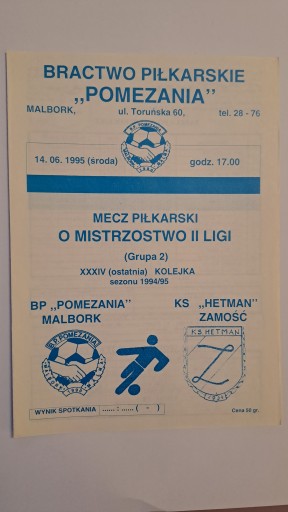ПОМЕЗАНИЯ МАЛЬБОРК - ГЕТМАН ЗАМОСЦИ 14.06.1995 ПРОГРАММА МАТЧА