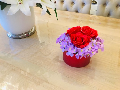 - róże mydlane czerwone, hortensje fioletowe, wysokość kompozycji 15 cm,
