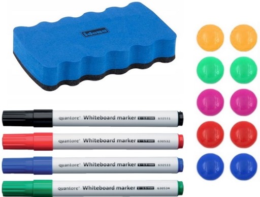 - Akcesoria w zestawie: Komplet markerów suchościeralnych, gąbka oraz magnesy w zestawie, by od razu rozpocząć pracę.