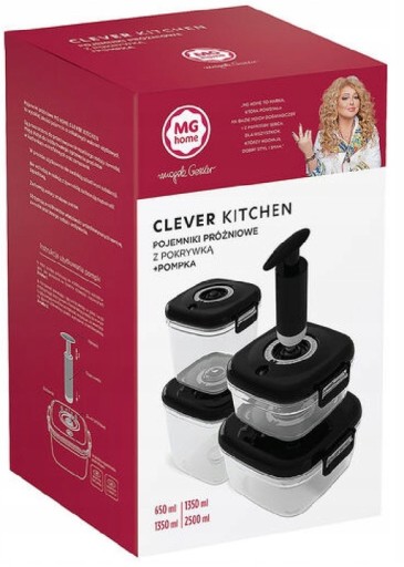 W zestawie otrzymujesz 4x pojemnik z pokrywką próżniową i 1x pompkę próżniową.