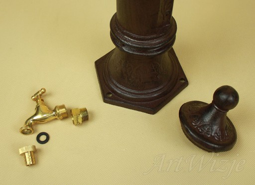 W zestawie ze zlewem mosiężny dekoracyjny kran oraz łącznik 3/4 cal służący do połączenia przez prześwit w słupku z wcześniej wykonanym przyłączem.