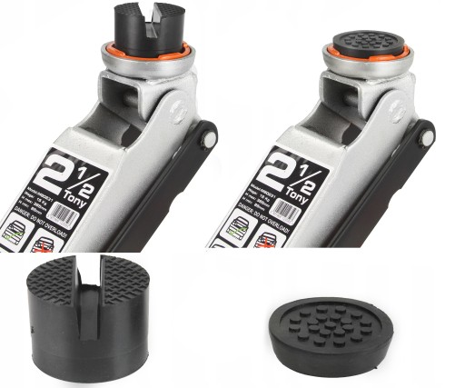 - W zestawie z podnośnikiem jest wysoka guma z wycięciem na próg. Guma z takim nacięciem gwarantuje stabilne umieszczenie samochodu w siodle podnośnika : wysokość gumy - 3,5 cm / / / średnica gumy - 4,5 cm