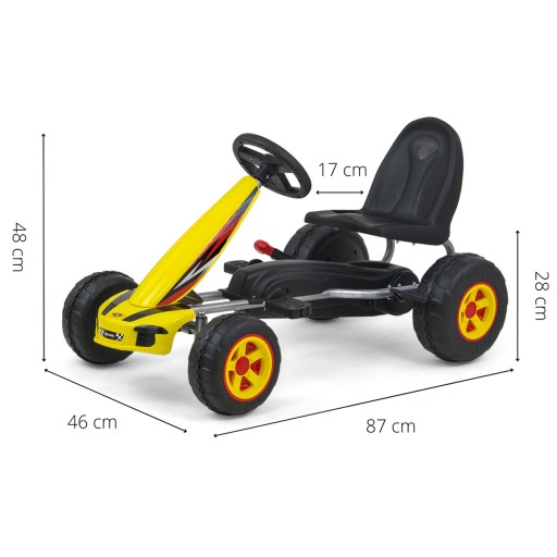 CHARAKTERYSTYKA: gokart ma sportowy ergonomiczny i nowoczesny kształt możliwość jazdy do przodu i do tyłu za pomocą pedału wygodne i eleganckie siedzisko z oparciem wyprofilowane siedzisko z 2 stopniową regulacją odległości od kierownicy sportowa trójramienna kierownica realistyczny wygląd hamulec ręczny zabawka wykonana z materiałów bezpiecznych dla dziecka plastikowe koła z kolorowymi felgami maksymalne obiążenie-30kg średnica kół przednich- 18,5cm średnica kół tylnych- 22 cm certyfikat bezpieczeństwa CE dostępny w 4 kolorach (różowy, biały, czerwony, niebieski, żółty) przedział wiekowy 3+