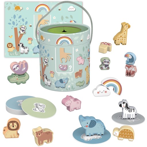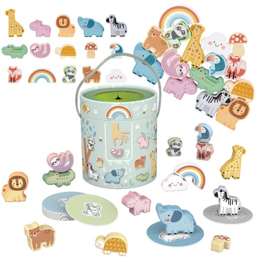 Tajemnicze Pudełko od Woopie to świetna wielofunkcyjna gra , która zapewni zabawę samodzielną oraz towarzyską. Gra zawiera 15 drewnianych figurek w tym zwierzątka, grzybka, tęczę oraz uroczą chmurkę, wszystkie ukryte w tajemniczym pudełku. Dzieci wybierają jedną z 15 kart, sięgając do pudełka, za pomocą dotyku mają odnaleźć wskazaną na obrazku figurę poznając jej kształt. Tajemnicze pudełko to oryginalna gra która cieszy się dużą popularnością. Rozwija u dzieci zmysł dotyku. ćwiczy motorykę małą oraz uwagę. Zestaw pozwala na wiele wariantów kreatywnych zabaw, np. dopasowanie w pary, naukę kolorów, nazw zwierząt oraz układanie w stos.