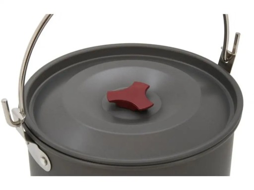 Garnek wykonany jest z anodyzowanego aluminium w kolorze ciemnoszarym Pokrywa jest wyposażona w uchwyt zapewniający wygodną obsługę, a sam garnek jest wyposażony w ukształtowany uchwyt do zawieszenia na haku nad ogniem.